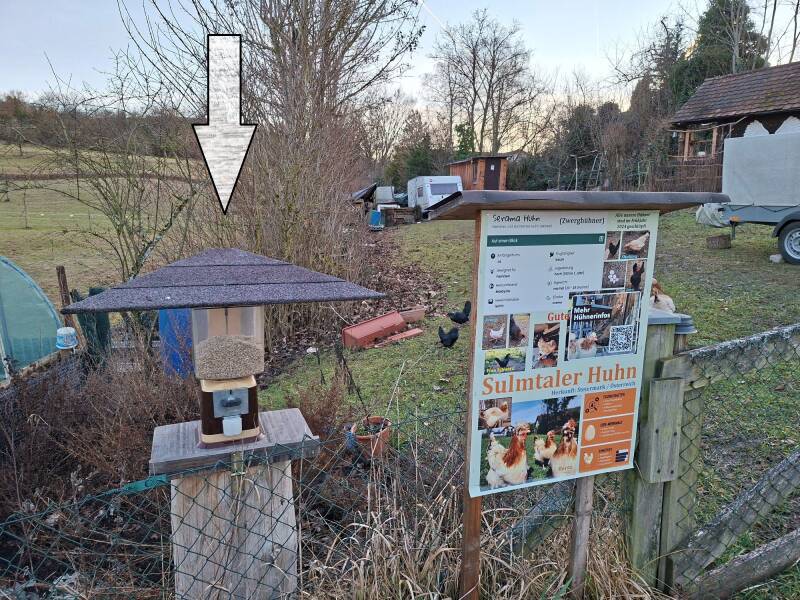 Wer den Hühnchen also einen Gefallen tun möchte darf gerne eine Hand voll Sonnenblumenkerne in den Garten werfen (bitte nicht mehr). Wer keine griffbereit hat kann dafür auch unseren Futterautomat nutzen: Einfach eine 50 Cent Münze in den Schlitz stecken, Kurbel drehen und aus dem Fach die Sonnenblumenkerne entnehmen. Im Automat befinden sich Bio-Sonnenblumenkerne.
