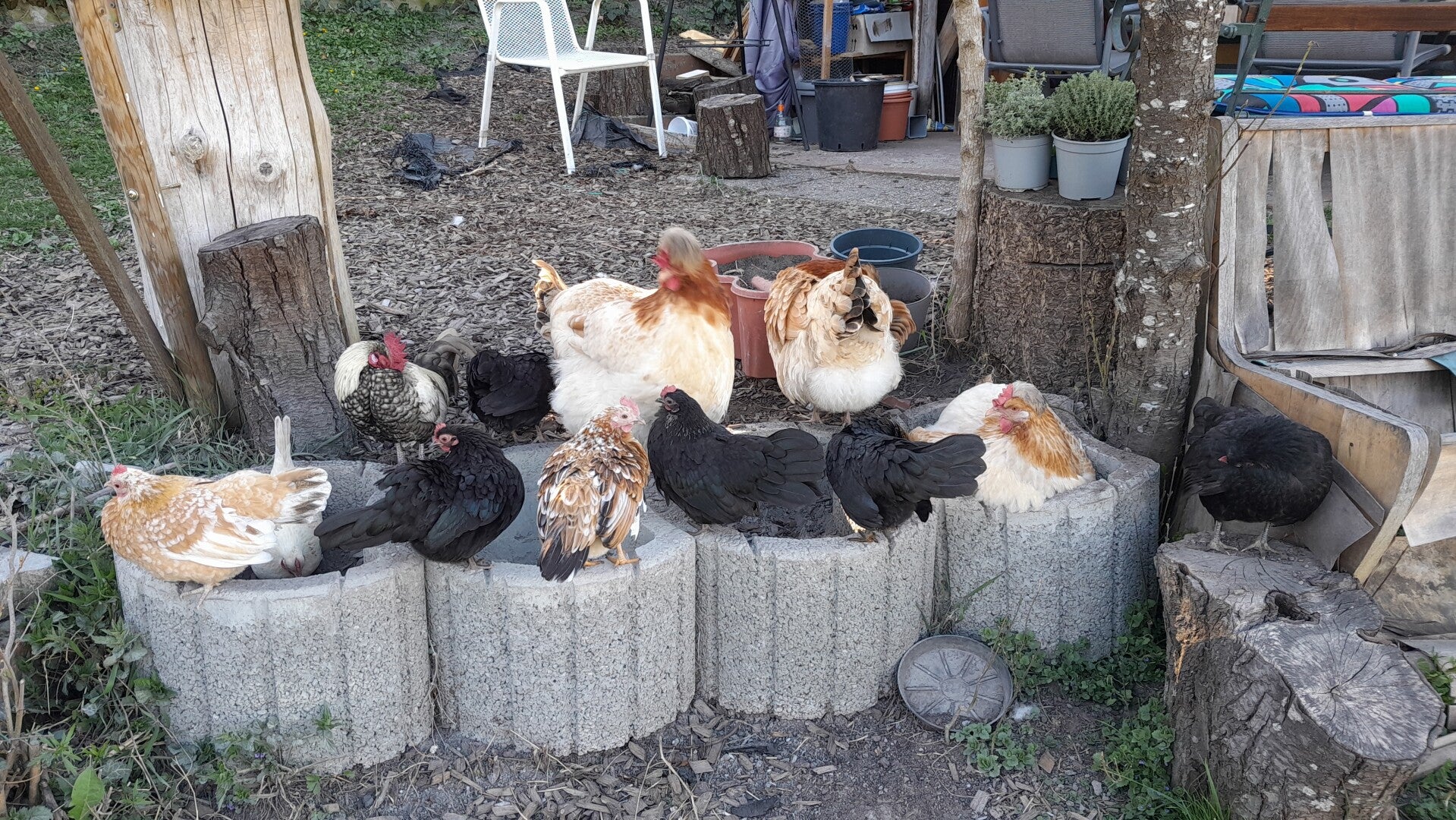 Aktuell sind es 18 Hühner (davon 9 Zwerghühner) und 1 Zwerghahn.